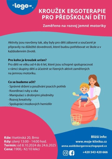 Ergoterapie pro děti ve věku od 4 do 6 let, které jsou schopné spolupracovat v rámci skupiny dětí a účastnit se řízených aktivit zaměřených na jemnou motoriku.