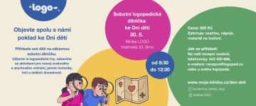 Přihlaste své děti na zábavné sobotní dopoledne, užijeme si zábavnou logopedii, vyrobíme dekorace ke Dni dětí, zabavíme se hrami na zahradě našeho Logáčku i v příjemném interiéru kliniky LOGO. Spolu objevíme poklad.