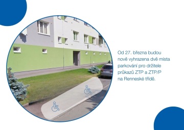 - Parkování pro držitele průkazu ZTP a ZTP/P: Od 27. března budou nově vyhrazena dvě místa na Renneské třídě pro osoby se zdravotním postižením.
