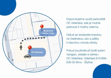 - Alternativní parkování: Doporučujeme využít parkoviště OC Vídeňská, kde je možné parkovat 2 hodiny zdarma. Odtud se dostanete brankou na Vsetínskou ulici a pěšky k hlavnímu vchodu kliniky. Pokud používáte při jízdě autem navigaci, zadejte si adresu OC Vídeňská, Vídeňská 815/89A, 639 00 Brno - Štýřice.